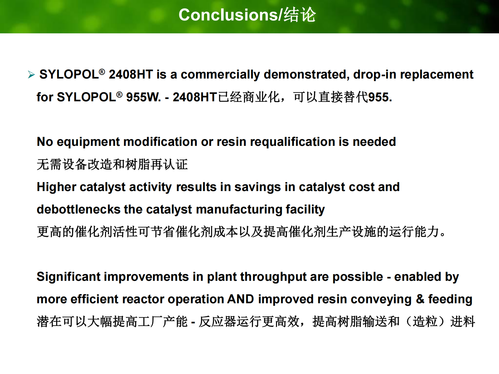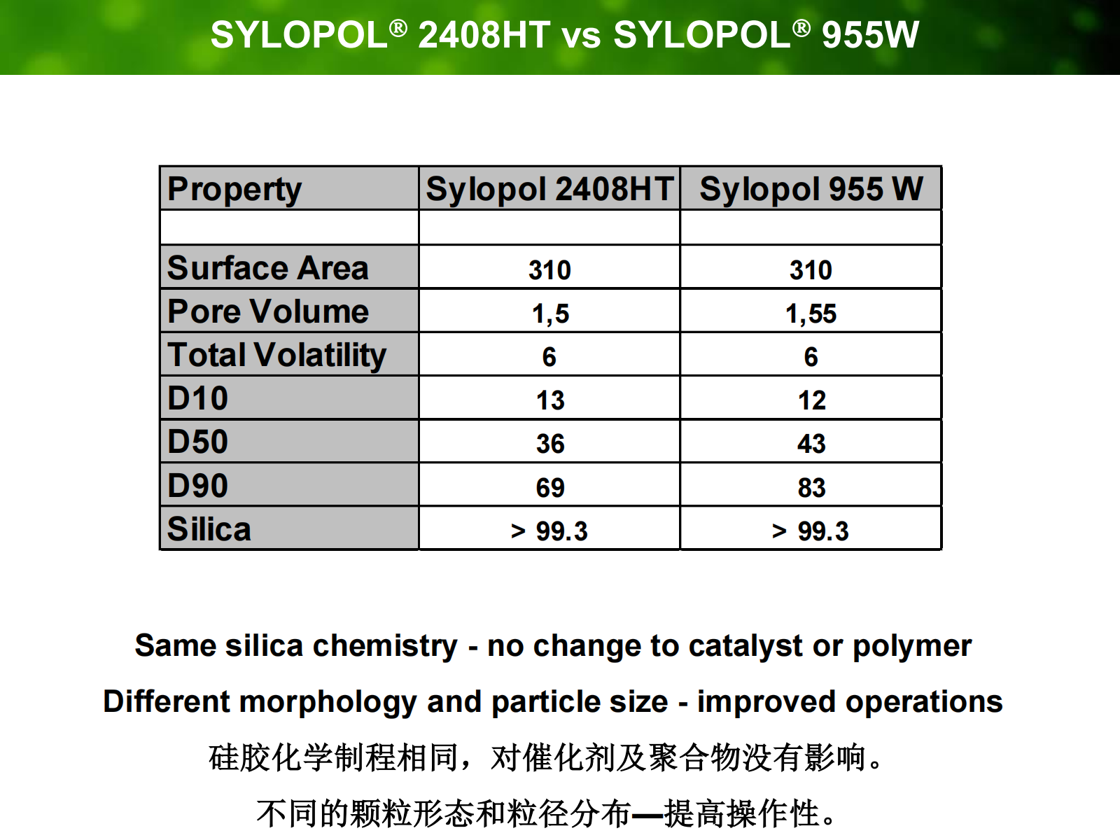 戴维森为UCC的UNIPOL工艺开发了二氧化硅载体.1980,格雷斯开发为Unipol开发了955W硅胶,2007年 格雷斯开发了2408HT,在反应过程及下游产品上都表现优异